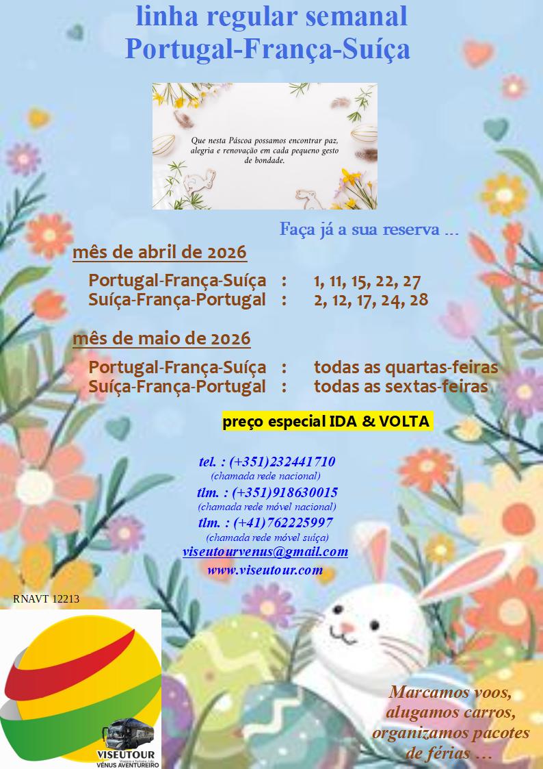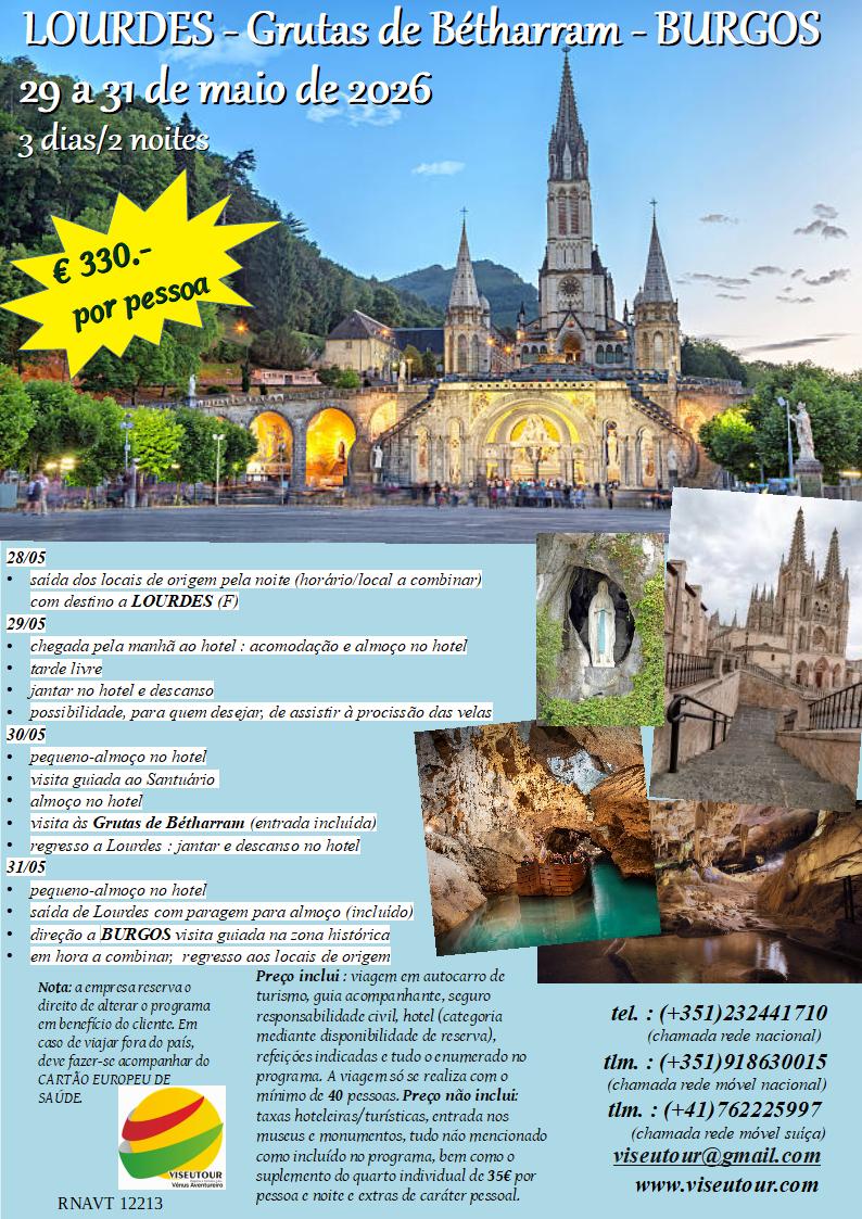 Fazemos todo o tipo de Excursões quer seja a nível nacional como a nível internacional. Com um autocarro comodo com serviço de Bar, WC, Bancos reclináveis, Ar Condicionado, Luz individual, 2 LCD e muito mais. O nosso conforto é o vosso bem estar. Organizamos também excursões de autocarro em cidades europeias, como Paris, Veneza ou Lourdes.